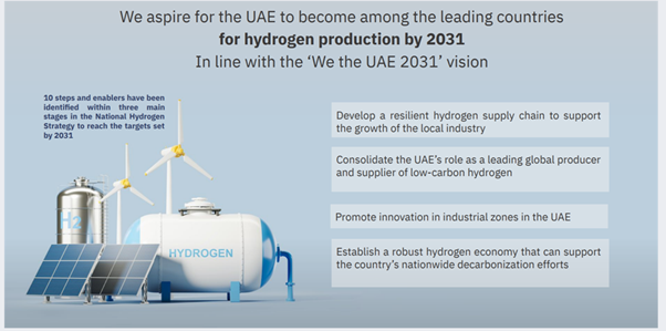 수소 전략은 크게 2030년까지의 단기 전략과 2050년까지의 중장기 전략으로 나뉜다. UAE는 오는 2030년까지 재생에너지 기여도를 3배로 확대하고, 2050년까지 넷 제로(Net Zero)를 달성하겠다고 밝혔다.
