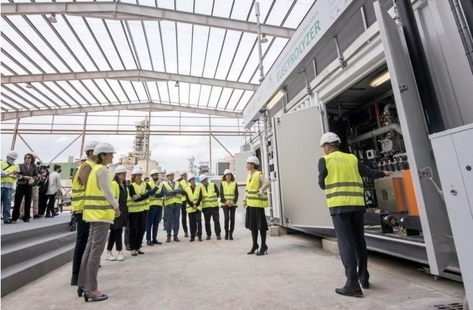 ▲ 지난해 3월 스페인 연방정부와 지방정부 관계자들이 커민스의 전기분해장치를 둘러보고 있다. (사진=IDAE)