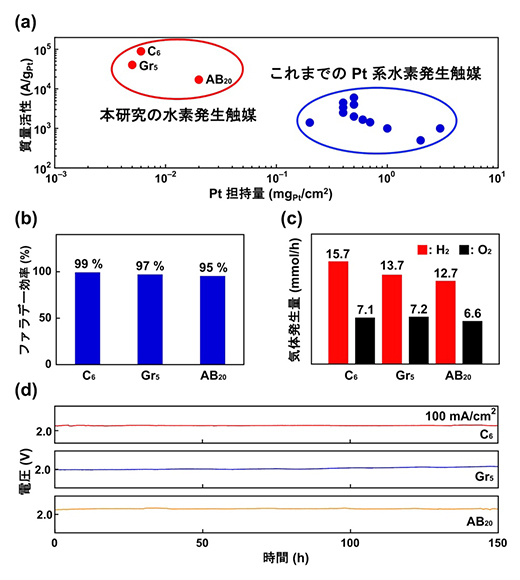作製したPEM水電解電極に電圧を加えると、水素発生に伴う電流が発生しました。2.0VにおけるC6、Gr5、AB20複合体の質量活性(白金の単位質量当たりの電流値)は、それぞれ89,300A/gPt、40,400A/gPt、17,100A/gPtであり、既報のPt系水素発生触媒と比べ、およそ100分の1のPt担持量で水素が発生することが分かりました(図2a)。また、これらの触媒のファラデー効率[11]は95%から99%であり、市販のPt/C触媒の効率(~100%)と同等の水素発生効率を示しました(図2b)。発生する気体は、H2とO2がほぼ2:1の割合であることから、水の電気分解(2H2O→2H2+O2)によって生じたことが分かります(図2c)。さらに、触媒の安定性を常圧、25℃で確認したところ、電流密度100mA/cm2のとき150時間連続して水素が発生することが明らかになりました(図2d)。