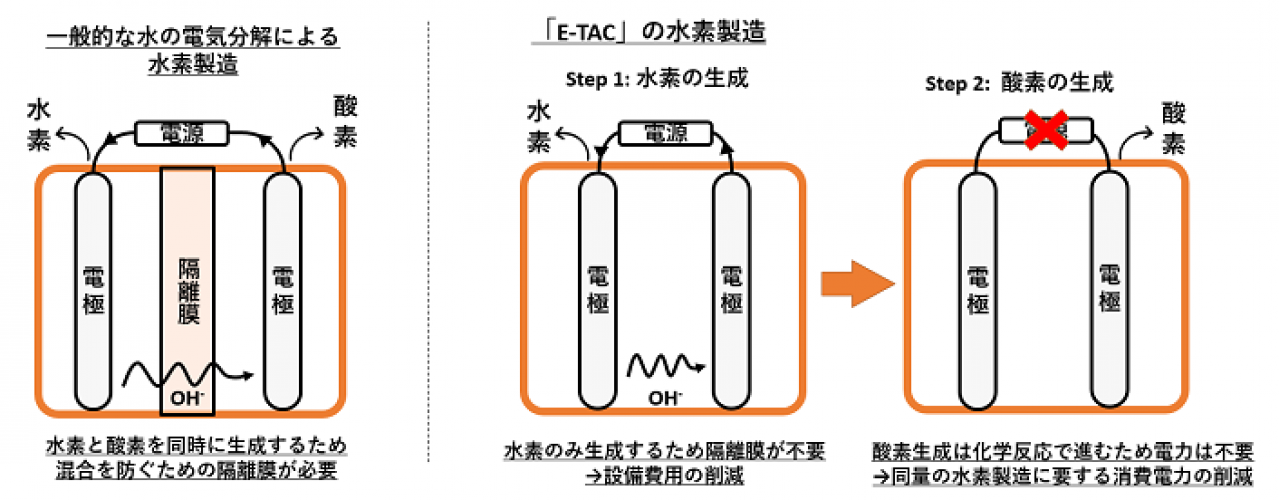 H2Pro社は、水の電気分解を改良した新たな水素製造技術「E-TAC」(注1)を開発している。通常の水の電気分解による水素製造では、酸素と水素が同時に発生するが、「E-TAC」はH2Pro社が開発した電極を用いて酸素と水素を別々に発生させる技術。これにより、酸素と水素の混合を防ぐための隔離膜(注2)が不要になることや、製造時のエネルギー効率が高くなることで、低コストでの水の電気分解の実現を目指す。「E-TAC」を実用化させ、一般的な電気分解での製造方法に比べ製造コストを大きく下げることで、水素エネルギーの普及に貢献する。