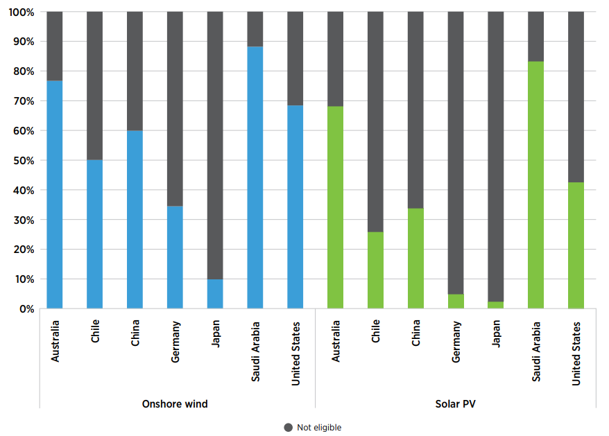 또한 재생에너지를 이용해 만드는 그린수소에서도 사우디의 잠재력은 무궁무진하다. 그린수소는 위에서 말한 바와 같이 태양광이나 풍력과 같은 재생에너지를 통해 얻은 전기에너지로 수소를 생산하는데, 이를 경제적으로 생산하기 위해서는 풍부한 태양광 에너지나 풍력 에너지가 필요하다. 태양광 에너지나 풍력에너지를 이용하기 위해서는 이에 걸맞은 지리적 환경이 매우 중요한데, 사우디는 아래 차트와 같이 국토 면적의 대부분에서 태양광 에너지나 풍력 에너지를 발생시킬 수 있다.