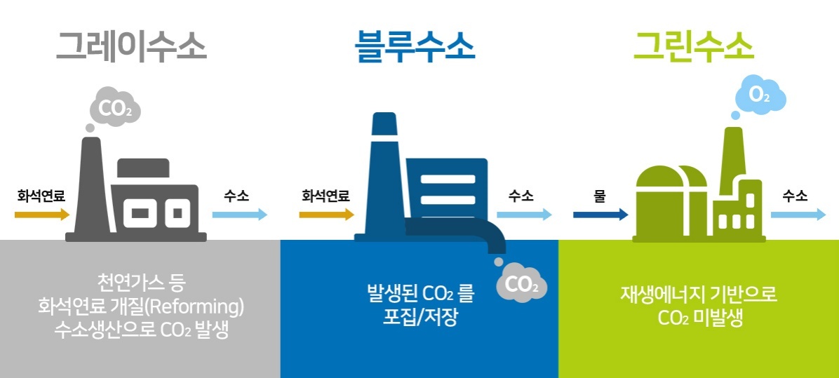 수소에너지는 생산 방식과 친환경성 정도에 따라 크게 그레이수소, 블루수소, 그린수소로 구분된다. 1) 그레이수소는 화석연료로부터 수소를 생산하고, 2) 블루수소는 그레이수소와 같은 방식으로 생산되지만, 생산 과정 중 발생하는 이산화탄소를 저장하는 기술을 통해 이산화탄소 배출을 최소화해 만드는 수소이고, 3) 그린수소는 물의 전기분해를 통해 얻어지는 수소로, 태양광 또는 풍력 같은 재생에너지를 통해 얻은 전기에너지를 물에 가해 수소를 생산하는 수소로 가장 친환경적으로 수소 에너지를 만드는 방식이다.