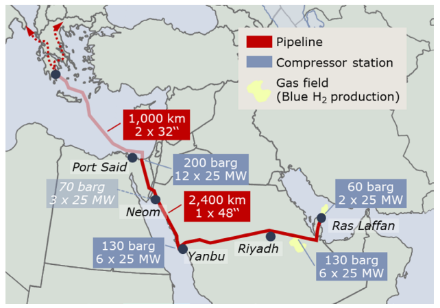 중동과 유럽을 잇는 수소 파이프라인은 카타르에서 그리스까지 총 3,400km로 구상되었다. 카타르에서 출발하는 육상 파이프라인은 사우디 리야드, 얀부, 네옴을 지나 이집트 포트사이드까지 총 2,400km로 구성되고, 포트사이드에서 그리스까지는 해상 파이프라인 1,000km로 구성되어 있다. 현재는 카타르 북부 가스전과 사우디 하라드 가스전이 주 공급처이며, 추후 네옴, 이집트에서도 잠재적인 추가 공급이 있을 것으로 전망된다. 육상 파이프라인은 48인치 스트랜드 1개로 구성되어 있고, 해상 파이프라인은 32인치 스트랜드 2개로 구성되어 있는데 그 이동량은 거의 비슷할 것으로 추측된다. 이는 육상에서의 수송 복합성과 비용을 절감하기 위해 1개의 스트랜드*로 고안되었고, 해상에서는 부설되는 깊이에서의 압력을 지지하기 위해 2개의 스트랜드로 분할하는 방향으로 고안되었다.