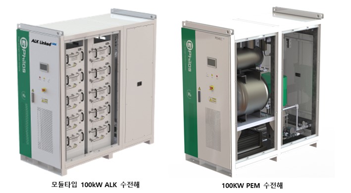 모듈타입 100kW ALK 수전해(왼쪽)와 100kW PEM 수전해.