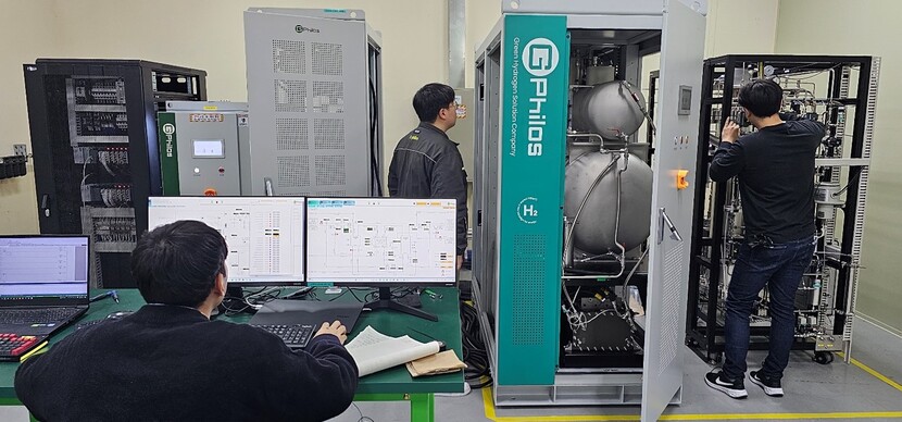 지필로스 직원들이 PEM 수전해 100kW 제품에 대한 성능시험을 진행하고 있다.