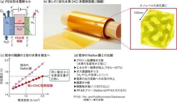 これに対し、東レが2021年に発表した「炭化水素系(HC)電解質膜」は、同社が20年かけて開発してきた成果だという。プロトンの伝導率がNafionの2倍と高いだけでなく、AWEでも重要だったガス透過性や強度、耐熱性など多くの点でNafionの特性値を大きく上回る(図1)。