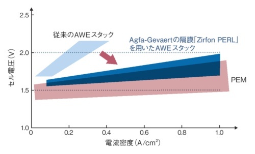 一方、Zirfon PERLを用いると2V弱の印加電圧で1A/cm2以上の電流を流せる。PEM用セルスタックの性能に肉薄するわけだ。