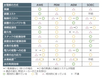 この方式の違いは、水電解技術やその装置に関する量産規模以外の競争軸でもある。ただ、現状では断トツに優れた方式というのがなく、それぞれ一長一短を抱えている(図1)。どの方式を選択するかはそのメーカーの事業戦略次第ともいえる。