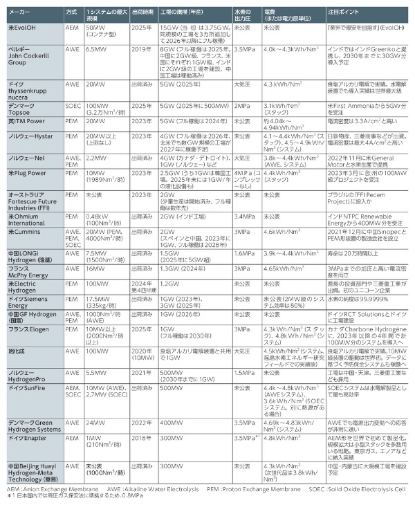そうした中、これまでのIT(情報通信)、エレクトロニクス機器、太陽電池や風力発電プラント、そして電気自動車(EV)や蓄電池といった成長産業がそうだったように、既存の水電解装置メーカーに加えて、多くのベンチャー企業が雨後のたけのこのように誕生している。2021年に設立したばかりだが、既に「ユニコーン」と呼ばれる時価総額が10億米ドル(約1500億円)を超える米Electric Hydrogen(EH2)のような非上場企業も現れている(表1)。同社には、鹿島ベンチャーズや三菱重工業など日本の企業も出資している。