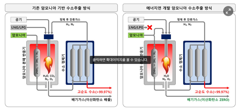 암모니아를 원료로 고순도 수소를 생산하기 위해서는 600도(℃) 이상의 고온에서 루테늄(Ru) 촉매를 이용해 암모니아를 분해하고 압력변동흡착(PSA) 기술을 이용해 수소를 정제해야 한다. 이 과정에서 질소와 수소가 포함된 잔류가스가 발생하고 암모니아 분해 반응기 열원으로 재사용된다. 다만 잔류가스만으로는 열량이 부족하기 때문에 추가적으로 열량을 보충해 주어야 한다.