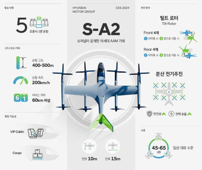 슈퍼널이 공개한 S-A2의 사양을 보면 전장 10m, 전폭 15m로 조종사를 포함해 5명이 탑승할 수 있다. 최대 500m 고도에서 시속 200km로 비행하는 것을 목표로 한다.