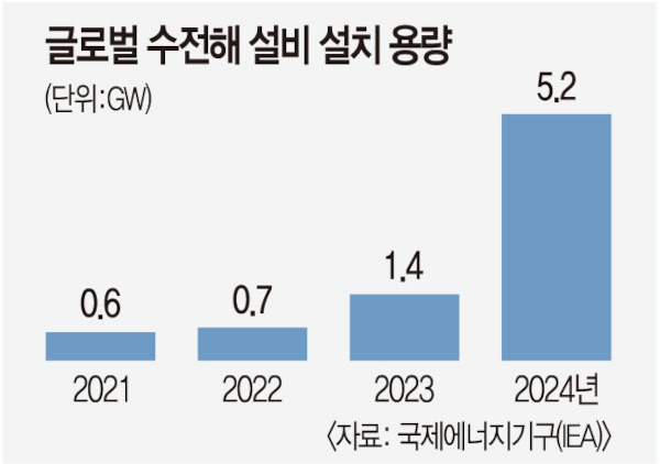 수전해는 물을 전기로 분해해 수소를 만드는 과정이다. 신재생에너지로 생산한 전기를 수전해에 활용해 만든 수소가 그린수소다. 그린수소는 화석연료 기반의 그레이수소나 이산화탄소 포집·활용·저장(CCUS) 기술을 활용하는 블루수소와 달리 생산 과정에서 이산화탄소를 전혀 배출하지 않는다. 국제에너지기구(IEA)에 따르면 글로벌 수전해 장치 설치 용량은 지난 2021년 0.6GW, 2022년 0.7GW, 2023년 1.4GW에서 지난해 5.2GW로 증가세다.