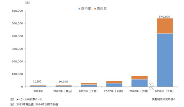 矢野経済研究所は2025年5月14日、燃料電池システムおよび部材の世界市場に関する調査結果を発表した。 調査によると、2024年の業務・産業用燃料電池システムの世界市場規模(メーカー出荷容量ベース)は前年比3.6%増の550MWになると推計。世界的な電力需要の増加や燃料電池産業の育成に関する支援施策の拡充が需要を押し上げた。中でもデータセンター、人工知能(AI)、暗号通貨セクターなどでの電力需要の急増が追い風になっているとした。 また、自動車用燃料電池システムの世界市場規模(メーカー出荷台数ベース)は、前年比25%減の1万1960台と推計している。2024年は中国市場において補助金支給の遅れや水素価格の高止まりなどにより、商用車向けの需要が伸び悩んだことが影響した。また、乗用車向けでは車両や燃費価格の高さ、水素ステーションが少ないという二つの要因から減速傾向が鮮明となったため、市場全体は縮小したとしている。 2025年以降の見通しについては、今後、主要自動車メーカーからFCV(燃料電池車)の新モデルが市場に投入されることで、乗用車向け燃料電池システム市場は回復基調に転じると予測。商用車向けでは中国に加え、欧州や日本でもトラックやトレーラー用の需要が本格化し、乗用車向けよりも高い市場成長率で推移する見通し。この結果、2032年の自動車用燃料電池システムの世界市場規模(メーカー出荷台数ベース)は54万台程度になると予測している。
