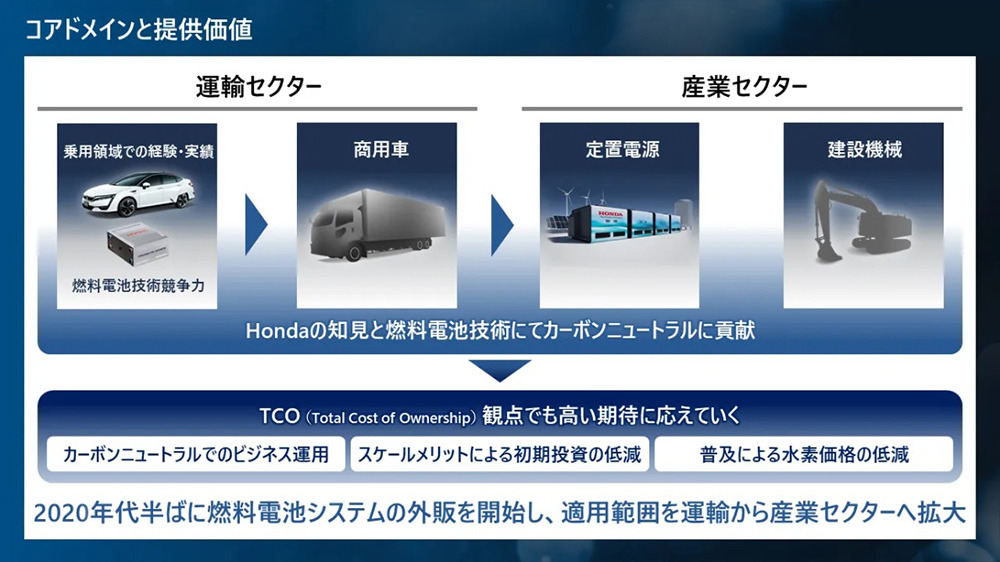 ホンダは、燃料電池システムを搭載する製品として、燃料電池車(FCEV)のほか、商用車、定置用発電機、建設機械の4つを想定し、水素事業を新たな事業の柱として成長させるとしてきた。自社開発・生産する次世代燃料電池システムの強みを生かし、燃料電池トラック分野において2030年シェア5%、野心的な目標として2040年頃にシェア30%を目指すと公表している。