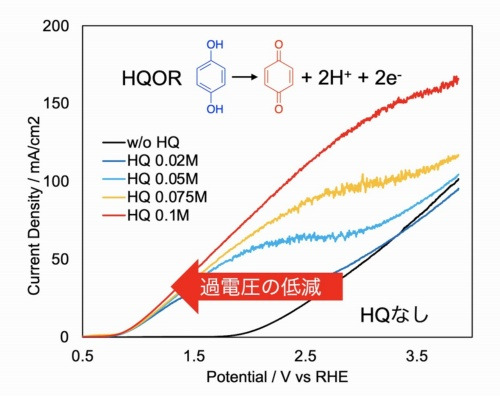 この研究は、東北大学材料科学高等研究所とAZUL Energy、東北大学バイオ創発共創研究所が共同で実施した。HQを電解液に添加することにより、低過電圧で水素を製造できる「再生レドックス媒介電解システム」(RReMES)を実現した。安価で入手しやすいHQを利用し、イリジウム(Ir)などの希少金属を使わないのが利点だ。