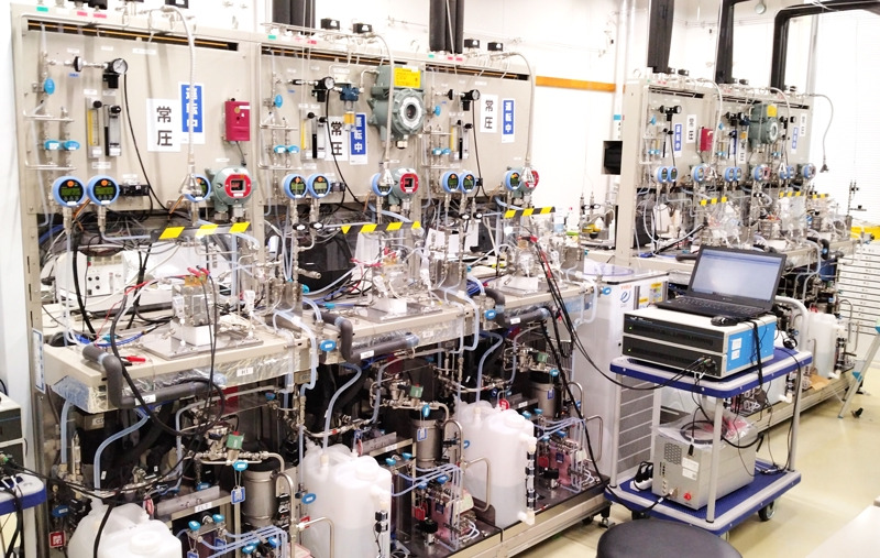 62台のセル評価装置をそろえ「同時に60種類以上を評価でき、トータル2万時間以上は動かしている」(新材料・デバイス研究開発グループ)という構えで開発速度を上げる。また、水素利用で先行する欧州では、つくった水素をすぐに高圧でパイプラインに流す仕様が多いため、4メガパスカル(メガは100万)の圧力に対応した試験装置も導入した。