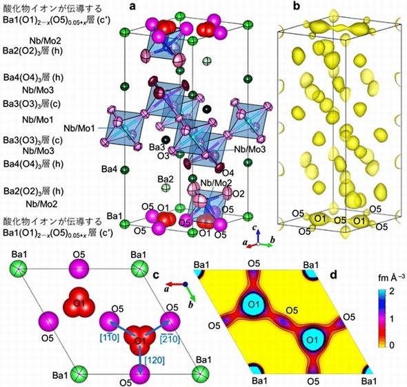 東京工業大学理学院化学系の八島正知教授らによる研究グループは2021年1月、新しい酸化物イオン伝導体「Ba7Nb3.9Mo1.1O20.05」を発見したと発表した。世界最高クラスの酸素イオン伝導度を示し、希土類を含まないため安定性や安全性にも優れている。燃料電池や酸素分離膜、触媒、センサーなどへの応用が期待される。 酸素イオン伝導体やO2-伝導体とも呼ばれる酸化物イオン伝導体はこれまで、その多くが希土類やビスマス、鉛、チタンを含む酸化物であった。今回発見したBa7Nb3.9Mo1.1O20.05は、これらの元素を含まない、六方ペロブスカイト関連酸化物の酸素イオン伝導体である。 研究グループは今回、「Ba7Nb4MoO20」に着目した。その理由として4つを挙げた。「構成元素が、酸化物イオン伝導体Ba3MoNbO8.5-δと同じである」「六方ペロブスカイト関連酸化物である」「構造がBa3MoNbO8.5-δと同様に、酸化物イオンが動くと期待される、本質的な酸素欠損層c′を持っている」「結合原子価法で計算した酸化物イオンの移動に対するエネルギー障壁0.21eVが、Ba3MoNbO8.5-δの障壁0.51~0.35eVより低く、高い酸化物イオン伝導度が期待される」からである。 研究グループは、さまざまな化学組成のBa7Nb4MoO20固溶体を合成し電気伝導度を測定した。この結果、Ba7Nb3.9Mo1.1O20.05が最も高い伝導度を示すことが分かり、その電気的性質と結晶構造を詳細に調べた。 この結果、「酸素濃淡電池で測定したBa7Nb3.9Mo1.1O20.05のO2-輸率が1に近く、全電気伝導度が極めて広い酸素分圧の領域において一定である」こと。さらに、「高い酸素の拡散係数を示し、プロトンの輸率が湿潤雰囲気でも低い」ことなどが明らかとなった。 さらに、O2-が支配的なキャリア(電荷担体)であることが分かった。Ba7Nb3.9Mo1.1O20.05の伝導度は、500℃以下でYSZや六方ペロブスカイト関連酸化物Ba3MoNbO8.5-δより高く、300℃では酸化ビスマス固溶体の伝導度より高いことが判明した。 Ba7Nb3.9Mo1.1O20.05の伝導度が、低温側でBa3MoNbO8.5-δより高い理由は、酸化物イオン伝導度の活性化エネルギーが低いからだという。高温かつ広い酸素分圧の領域において、酸素濃淡電池を用いた起電力測定前後で、Ba7Nb3.9Mo1.1O20.05の劣化や結晶相の変化は観測されず、相安定性に優れていることが分かった。 研究グループは、高い酸化物イオン伝導度の構造的要因を調べるため、大強度陽子加速器施設(J-PARC)で、800℃におけるBa7Nb3.9Mo1.1O20.05の中性子回折実験を行い、リートベルト法によって結晶構造を解析した。イオン伝導経路を可視化するため、最大エントロピー法を用い中性子散乱長密度分布も解析した。これにより、Ba7Nb3.9Mo1.1O20.05が800℃で六方ペロブスカイト関連酸化物であることを確認した。 また、Ba7Nb3.9Mo1.1O20.05の結晶構造は、酸素欠損層(c′層、BaO2.05層)が(001)面上に存在しており、格子間八面体酸素O5と格子四面体酸素O1間に中性子散乱長密度の連続した分布を観察することができた。格子間酸素O5と格子酸素O1を経由した拡散は、準格子間機構を現したもので、酸化物イオン伝導における格子間酸素の重要性を示したものだという。これらのことから、格子間酸素量を増やすことが、六方ペロブスカイト関連酸化物イオン伝導体の設計指針になるとみている。