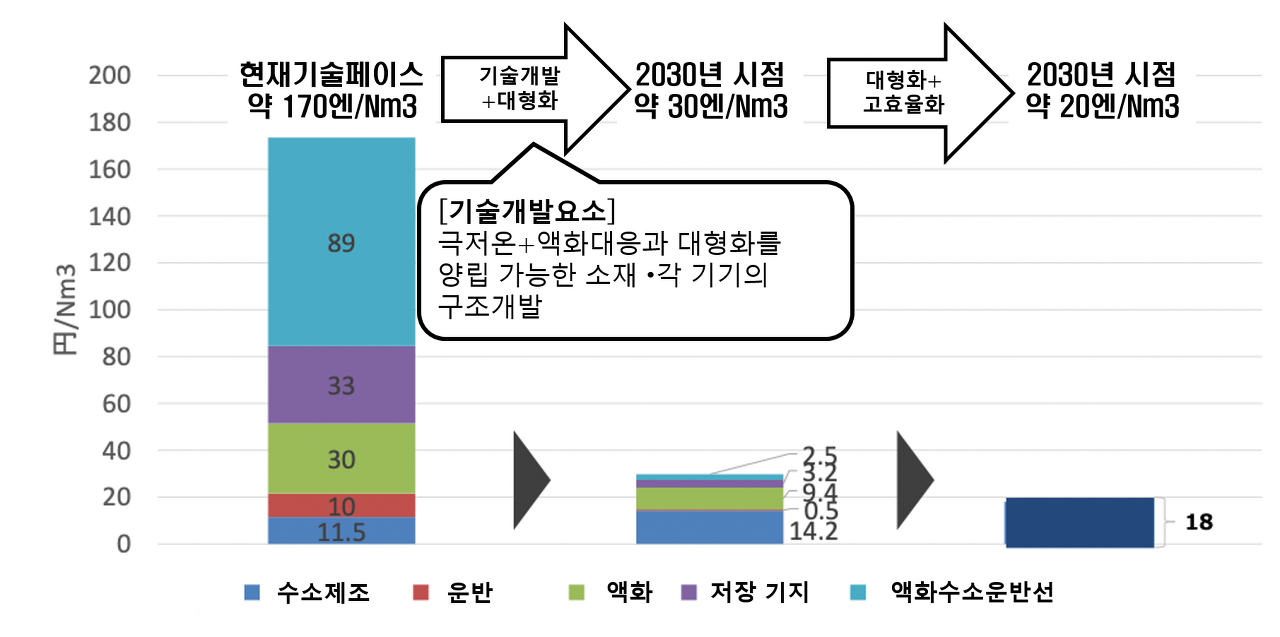 다양한 방식 중에서 현재 <액화 수소>와 <MCH> 기술이 현재 상용화에 더 가까운 상황으로 보인다. 액화 수소의 경우 구성기기의 대형화 및 고효율화를 통한 비용 절감을 목표로 2030년에는 30엔/Nm3, 2050년에는 약 20엔/Nm3의 비용 감소를 목표로 기술 발전을 진행하고 있다. 이를 위해 로딩 암, 육상 저장용 탱크 등의 다양한 상용 기술 개발에 박차를 가하고 있다
