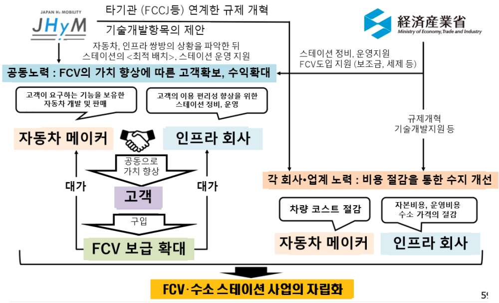 수소 스테이션의 적극적인 도입을 위해서 현재 인프라 사업자와 자동자 사업자들이 연계해 <일본 수소 스테이션 네트워크 합동회사 (JhyM,제이하임)>을 설립하여 각 지방자치단체들과의 협의를 통한 전략적인 수소 스테이션 도입을 추진하고 있다. 제이하임에는 현재 토요타, 혼다, 닛산 등 자동차회사 외의 에노스, 이와타니 등 인프라 기업들 등 총 25개사가 참여해 수소 스테이션의 보급을 위해 노력하고 있다.
