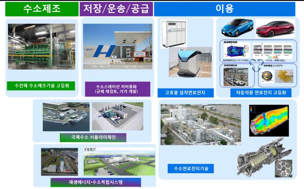 일본의 수소산업의 기본은 2017년 12월 <수소기본전략>에서 출발한다. 2050년까지의 장기 비전을 바탕으로 2030년 도달 목표를 세운 기본 틀에서 2019년 3월 <수소·연료전지전략 로드맵>, 2019년 9월 <수소·연료전지기술개발전략을 통해 중전적 기술 개발 목표들을 구체화했으며 2020년 12월 <탄소 중립을 위한 그린성장전략>을 통해 탈탄소 사회를 위한 수소의 대량 공급을 목표로 전 분야에서의 혁신을 추진하고 있다.
