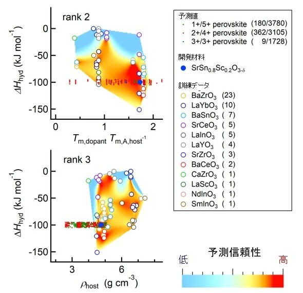 九州大学と岐阜大学、宮崎大学らの研究グループは2021年8月、新たに開発したAI(人工知能)モデルを活用し、中温動作の固体酸化物形燃料電池(SOFC)に用いる「新規プロトン伝導性電解質」を、わずか1回の実験で発見したと発表した。 SOFCは、固体酸化物を電解質として用いた燃料電池である。燃料電池の中では最も高いエネルギー変換効率を有するが、現行の固体酸化物は動作温度が700~1000℃という高温でないと、高いイオン伝導性を示さないため、構成する材料が高価なものに限定されていたという。 こうした中、中温動作のSOFC電解質材料として注目されているのが、約400℃で高いイオン伝導性を示すプロトン伝導性酸化物である。特に、ペロブスカイト酸化物(一般式はABO3)は、最も期待されている候補材料だという。ただ、これを構成する元素の組み合わせは、ほぼ無限に存在する。このため、新たなプロトン伝導性電解質の開発においては、これまで技術者の経験と勘に頼ってきたのが現状だ。 研究グループは今回、最適な元素の組み合わせを短期間で探索するためのAIモデルを開発した。具体的にはまず、22組成の既存材料を合成し、熱重量分析(TGA)で得られた高精度のプロトン濃度データと信頼できる文献値を用い、65組成・761データで構成された訓練データベースを構築した。 次に、この訓練データを80の記述子とプロトン導入反応の物理化学的知見とともに学習させた。これによって、未知材料(CABO3)におけるプロトン濃度の温度依存性を予測するAIモデルを開発した。 この時、物理化学的知見として「金属酸化物中におけるプロトン濃度はアクセプター濃度に比例する」ことをAIに学習させた。この結果、訓練データ数が761点と比較的少ない場合でも、材料中におけるプロトン濃度の温度依存性を精度よく予測できることが分かった。 開発したAIモデルを用い、8613種類の材料についてプロトン濃度の温度依存性を予測した。その結果を化学組成空間や、記述子空間において構造-特性マップとして可視化。その上で、プロトン伝導性が発現する可能性の高い材料候補を12に絞った。この中から1つ、合成する材料を研究グループが選んだ。 具体的には、AIが予測した材料の中から、「ΔHhydが-100±5kJ mol-1の水和エンタルピーを有し、かつ予測信頼性が高い領域に存在し、さらに従来プロトン伝導性が知られていない母結晶材料」という条件で絞り込んだ。この結果、「SrSn0.8Sc0.2O3-δ」が候補材料として浮かび上がったという。 研究グループは、候補材料のSrSn0.8Sc0.2O3-δを実際に合成して、実験を行った。そして、発見した新規プロトン伝導性電解質のプロトン濃度は、400℃以上の温度域において、AIが予測した値とほぼ一致していることが分かった。 今回の成果は、九州大学エネルギー研究教育機構(Q-PIT)、稲盛フロンティア研究センターおよび、大学院工学府材料物性工学専攻の山崎仁丈教授と、九州大学稲盛フロンティア研究センターの兵頭潤次特任助教、九州大学大学院工学府材料物性工学専攻博士後期課程の辻川皓太氏、岐阜大学工学部および理化学研究所の志賀元紀准教授、宮崎大学工学教育研究部の奥山勇治教授らが共同で行った研究によるものである。