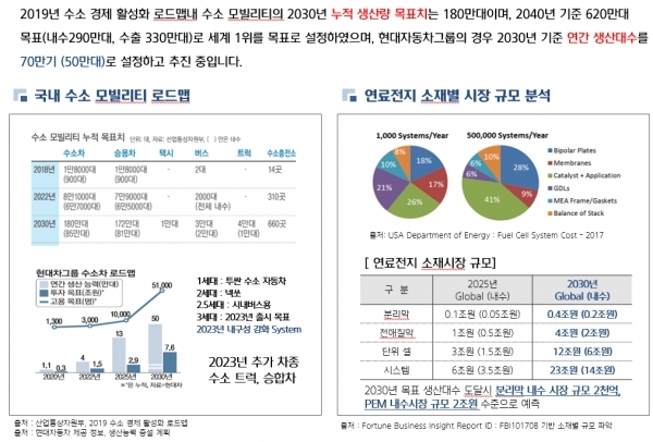 국내 수소 모빌리티 로드맵과 연료전지 소재별 시장 규모 분석. ⓒ산업통상자원부, 현대차, FBI