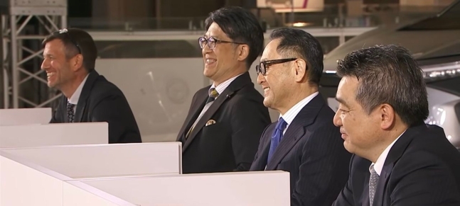 한 일본인 기자가 도요다 아키오 도요타 사장에게 "사장, 당신은 전기차를 좋아하나요, 싫어하나요?”라고 묻자, 아키오 사장을 비롯한 Q&A 세션에 참석한 도요타 관계자들이 전부 웃고 있다. 아키오 사장은 최근까지 일본 업계에서 전기차 혐오론자로 알려져 있었다. /도요타 동영상 캡처