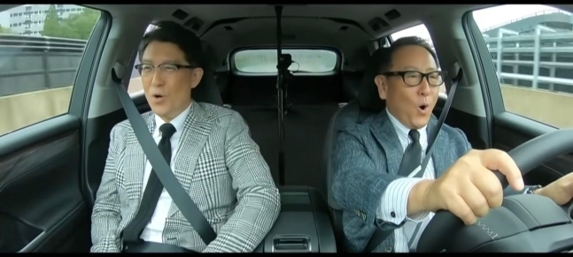 전기 SUV로 출시 예정인 렉서스 ‘RZ’를 아키오 사장이 운전하는 동영상. (도요타의 신차 주행성능을 최종 평가하는 마스터 드라이버로도 활동하는) 아키오 사장이 처음엔 “음, 차가 좀 무겁네! ’라고 부정적인 코멘트를 하다가, 풀가속하면서 ‘에~!(일본인 특유의 하이톤으로) 이거 완전히 별세계잖아?”라고 말하며 RZ 성능에 감탄하고 있다. /도요타 동영상 캡처