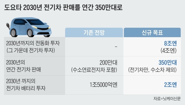 도요타는 2030년까지 전동화 차량에 8조엔을 투자하는데, 그 가운데 4조엔을 전기차 투자에만 쓸 예정이다. 2030년의 연간 전기차 판매는 기존 200만대(수소연료전지자 포함)에서 350만대(전기차만)로 대폭 확대 수정했다. 2030년까지 배터리 내재화를 위한 투자액도 종전의 1.5조엔을 2조엔으로 대폭 늘렸다.