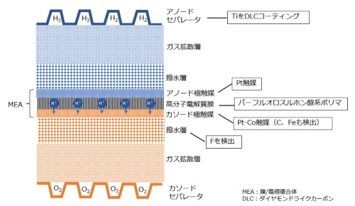FCセルの構造は、水素流路側から酸素(空気)の流路側に向けて次のような層構造をしていることが分かった。水素の流路を兼ねるアノードセパレーター、ガス拡散層、撥水層(はっすい)、アノード極触媒、高分子電解質膜、カソード極触媒、撥水層、ガス拡散層、カソードセパレーターである。ガス拡散層は、触媒にまんべんなく気体分子を送り込むための層、撥水層は反応などによって生じた水分を素早く排出する層である。燃料電池反応は、アノードとカソードの触媒および高分子電解質膜で構成されるMEA(Membrane Electrode Assembly、膜電極接合体)で進む。