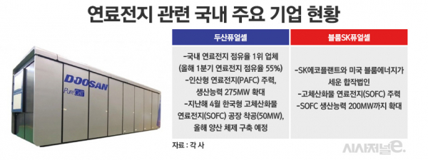 다만 양사가 주력으로 하는 제품은 장단점이 뚜렷해 시장 선점을 위한 경쟁이 치열할 것으로 보인다. 두산퓨얼셀의 주력 제품은 PAFC, 블룸SK퓨얼셀은 SOFC다. 지난해 4월 두산퓨얼셀은 새만금 산업단지에 SOFC 공장을 착공했으나 양산 체제 구축은 아직이다.