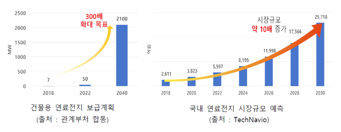 국내 연료전지 시장규모가 2030년까지 10배 이상 성장할 것으로 예상되는 가운데 전 세계 건물용 연료전지 시장규모 역시 같은 기간 8배 이상 성장할 것으로 전망된다.