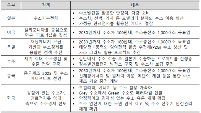 일본의 수소기본전략은 △수소발전을 활용한 안정적·다량소비 △수소차·선박·기차 등 모빌리티 분야의 수소이용 확산 △가정용 연료전지를 활용한 에너지 절감 등 내용을 포함하고 있으며 미국의 경우 캘리포니아주를 중심으로 민·관 파트너십을 결성함으로써 2030년까지 수소차 100만대, 수소충전소 1,000곳 설치를 목표로 수소활성화를 추진하고 있다.