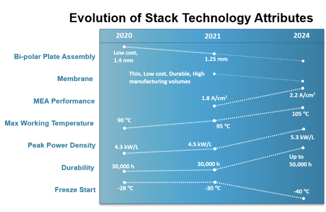 Continuous improvement to meet the market requirements for commercial vehicles requires an evolution in key fuel cell stack technology attributes. Our technical targets for the next four years are clear, as demonstrated in the chart below.