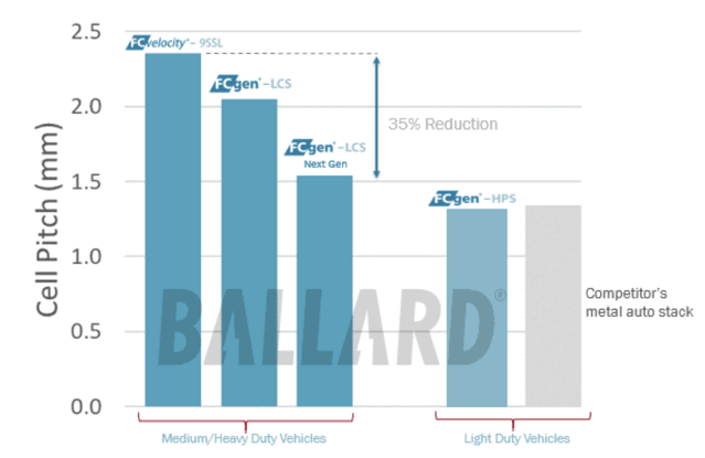 As you can see in the chart above, Ballard is on the path to achieving a 35% reduction in cell pitch, or bipolar plate assembly thickness in our latest fuel cell stack designs. This brings the cell pitch in alignment with our competitors using metal plates. Metal bipolar plates from automakers, however, are far higher in cost.Ballard bipolar platesare: